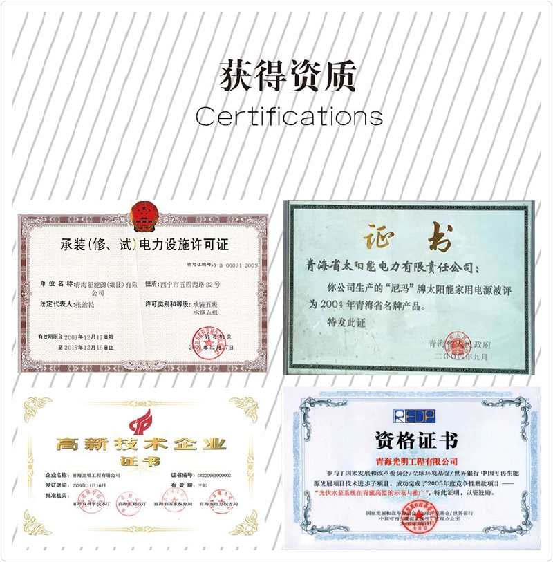 公司先后榮獲“全國專利先進(jìn)科技研究院”、“全國各族青年團(tuán)結(jié)進(jìn)步集體”、“青年文明號”,“青海省模范集體”,“全國教科文衛(wèi)系統(tǒng)先進(jìn)工會組織”、全省“學(xué)習(xí)型組織標(biāo)兵”單位、全國“創(chuàng)新性試點(diǎn)企業(yè)”、連續(xù)三年被中國農(nóng)業(yè)銀行青海分行授予“AAA信用企業(yè)”和“AAA優(yōu)良客戶”等榮譽(yù)稱號。公司擁有“尼瑪”牌太陽能。
